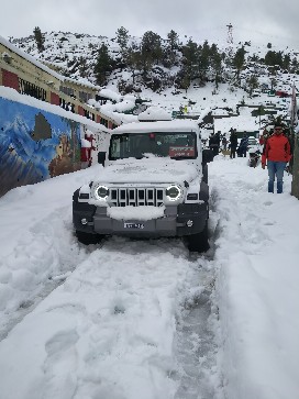 औली पासून जोशीमठकडे जाणासाठी पर्यटन खात्याची जीप सज्ज होतांना……..या महाकाय बर्फाच्या रस्त्यावरून मार्गक्रमण करणे सोपे नाही…….